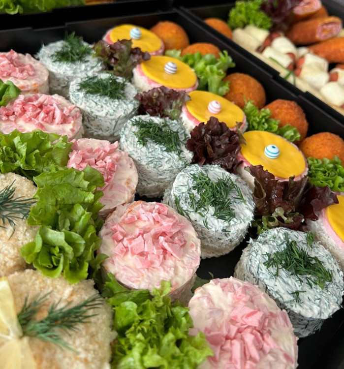 سینی سرد: شامل ۵ عدد کیک مرغ، ۵ عدد راتا ژامبون، ۵ عدد راتا سبزیجات، ۵ عدد کلاب کالباس، ۶ عدد توپک سیب زمینی ژامبون سوخاری