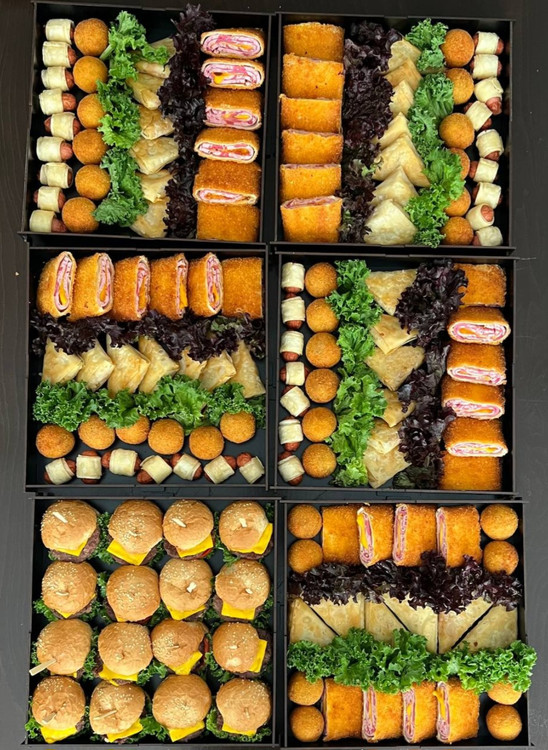 شامل : ۳۲ عدد رول سوخاری_۱۶ عدد مینی برگر _ ۳۲ عدد سمبوسه_۳۲ عدد توپک سیب زمینی_ ۳۲ عدد سوسیس انگشتی