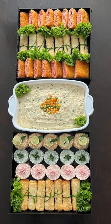 شامل : ۱۵ عدد رول سوخاری_۱۵ عدد اسپرینگ رول _۵ عدد کیک مرغ_۵ عدد راتا سبزیجات_ ۵ عدد راتا ژامبون_۱ کیلو الویه