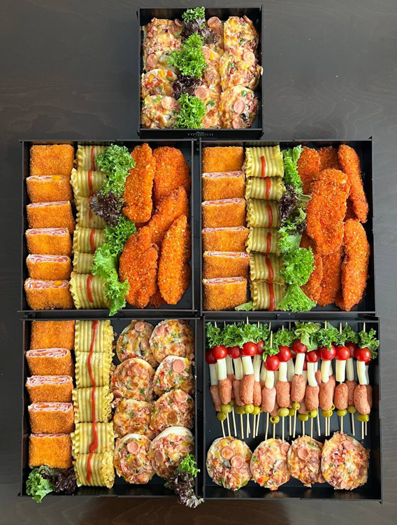 شامل : ۲۲ عدد پیتزا لقمه_ ۱۷ عدد رول سوخاری_ ۱۷ عدد لازانیا رولی_ ۲۰ عدد فیله سوخاری_۲۰ عدد سیخ سوسیس